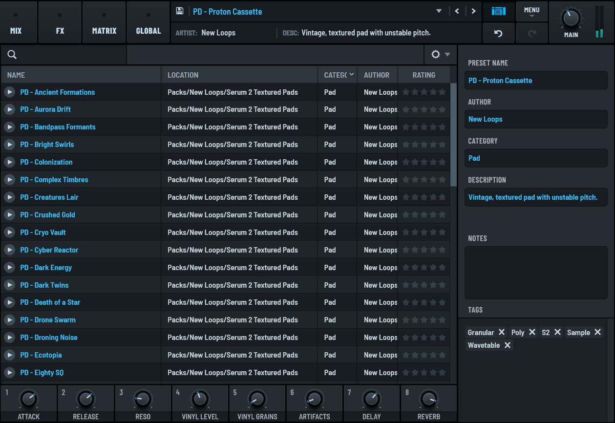 New Loops presents Serum 2 Textured Pads - 50 atmospheric, futuristic, cinematic pads and soundscapes built from 70 original custom audio samples. Layered across granular, spectral, sample, and wavetable oscillators, each preset delivers deep, evolving textures that feel alive: shimmering cosmic soundscapes, industrial resonances, sci-fi sound-fields, future-cinematic strings, alien sound textures, and distant machine hymns.
